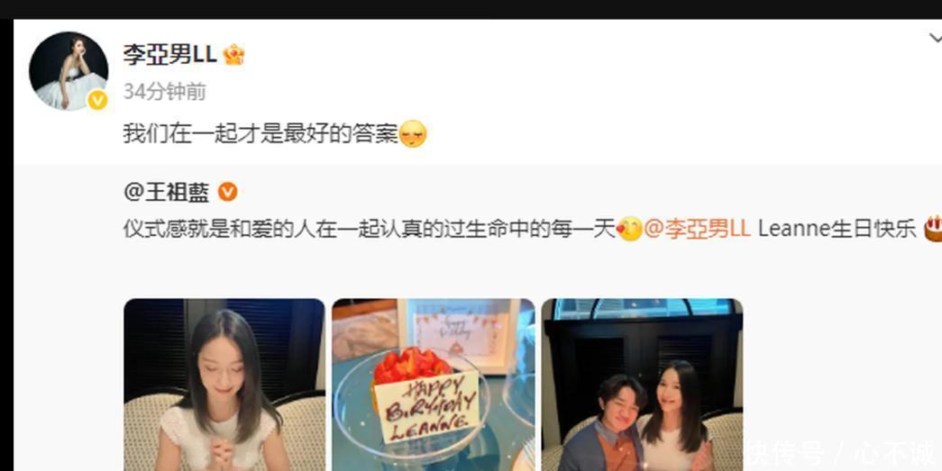 我们本期说下艺人王祖蓝和李亚男,25日,王祖蓝在社交平台上晒出合照为老婆李亚男庆生,二人坐在蛋糕前亲密合影,夫妻俩笑容满面,感情恩爱又甜蜜!王祖蓝在线表白老婆:“仪式感就是和爱的人在一起认真的过生命中的每一天,Leanne生日快乐。”李亚男回复道:“我们在一起才是最好的答案。”王祖蓝晒出蛋糕照片,夫妻俩好幸福。李亚男对着蛋糕许愿。