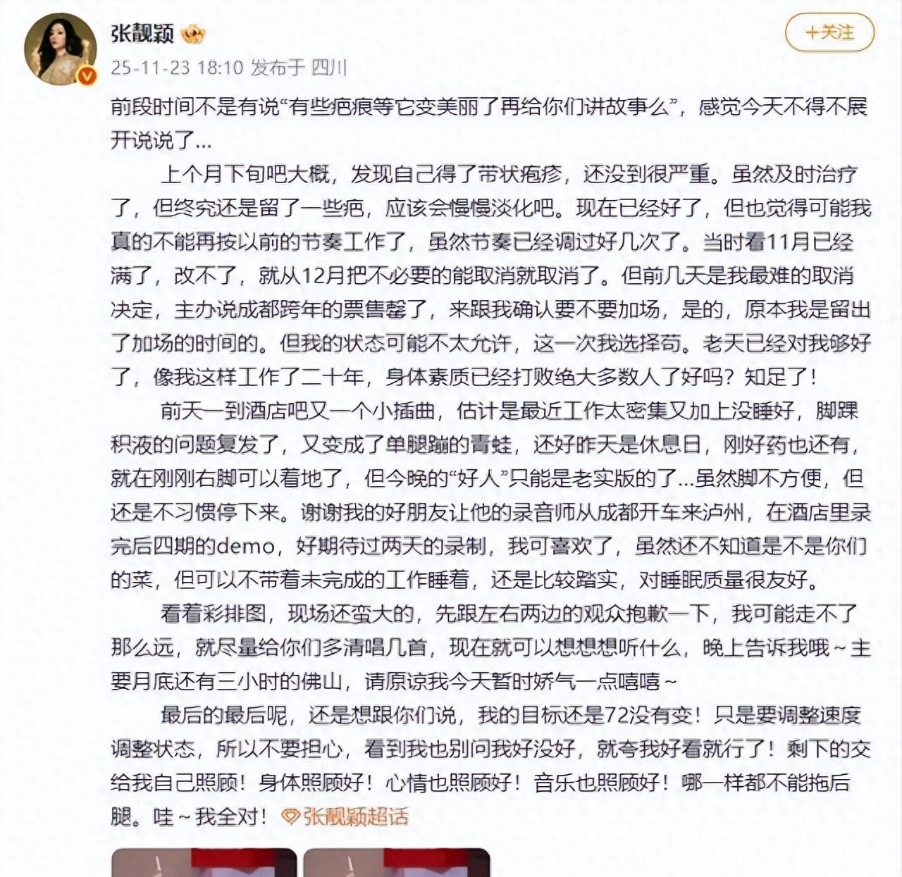 2025日,张靓颖通过社交平台发布长文,公开了自己上个月下旬确诊带状疱疹的情况。她表示,当时病情还没到很严重的地步,通过及时治疗,症状已经缓解,但皮肤上还是留下了部分疤痕,这些疤痕预计会慢慢淡化。她同时提到,脚踝积液的问题在前天复发,导致她只能单腿行走,像青蛙一样蹦跳。这次经历让她决定调整工作节奏,虽然之前已经多次调慢,但现在她选择月开始取消不必要的活动。其中,最难的决定是取消成都跨年演唱会的加场,因为主办方告知票已售罄,本来她留出了加场时间,但身体状态不允许。她强调,像她这样工年,身体素质已超过大多数人,这次选择保守一些。带状疱疹是一种由水痘-带状疱疹病毒引起的感染性皮肤病,该病毒在初次感染时导致水痘,痊愈后潜伏在脊髓后根神经节或颅神经节内,当机体免疫力下降时,病毒重新激活引发疾病。全球范围内,50岁以上人群的发病率𰹉.23.9每千人年,女性略高于男性,𰹊.05.8每千人年。在中国,带状疱疹是皮肤科常见病,影响患者生活质量,临床诊疗规范由中国医师协会皮肤科医师分会年制定,并于近年更新。病毒激活的原因包括高龄、免疫抑制状态,如HIV感染、恶性肿瘤、糖尿病、肾病、创伤或使用免疫抑制药物。50岁后,病毒特异性细胞免疫功能逐渐降低,导致发病率、住院率和病死率上升。在年轻人中,劳累、感染或其他因素导致免疫力低时也可能发病。日本一年的调查显示,4例患者中,8月发病率较高,冬季较低,与水痘流行呈反比。症状通常先表现为身体乏力、低烧、头痛、胃口不佳等全身性不适,出疹天出现皮肤灼热、麻刺或局部疼痛。皮疹为潮红斑,迅速转为粟粒至黄豆大小的丘疹,簇状分布,不跨身体中线,呈带状,常在腰骶部或面部。疼痛是突出症状,可为烧灼痛、深在性痛、放射性痛、撕裂性痛、异常性痛或痛觉过敏,轻微触碰即剧痛。重症患者疼痛可持年以上,影响睡眠,导致失眠、抑郁和焦虑。带状疱疹不传染,但病毒可传播给未患水痘者,导致其患水痘。